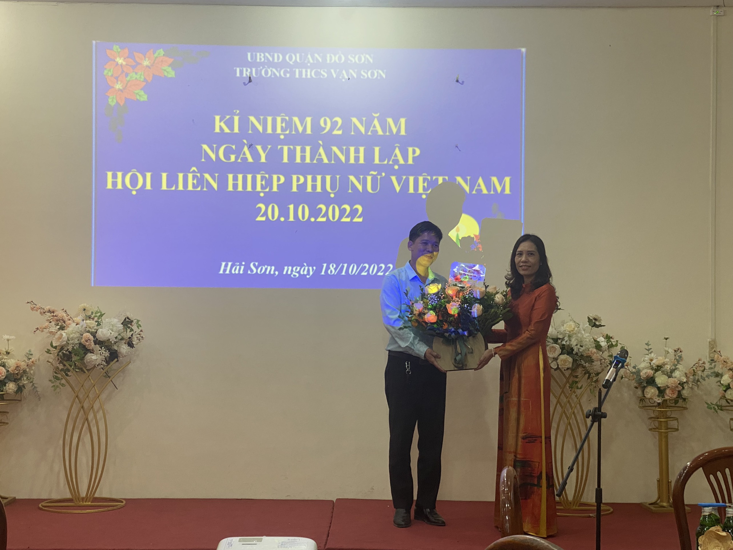 Kỷ niệm 20-10-2022. Công Đoàn trường THCS Vạn Sơn đã tổ chức liên hoan gặp mặt để cùng ôn lại truyền thống phụ nữ Việt Nam, Nhân dịp này đại diện giáo viên nam nhà trường cũng có những lẵng hoa tươi thắm chúc mừng các nữ cán bộ giáo viên. nhân viên nhà trường,